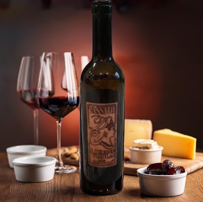 To perfectly complement these delicacies, the brand also offers an exceptional red Passito wine, crafted from late-harvested grapes of the indigenous Centesimino variety. Sweet and elegant, this wine is characterized by a velvety texture, deep ruby color, and a sophisticated aromatic bouquet with notes of rose, violet, black cherry, and delicate hints of vanilla and chocolate. Decorated with an aged bronze label, its harmonious structure pairs beautifully with the violet-scented preserve, creating a captivating symphony of flavors.